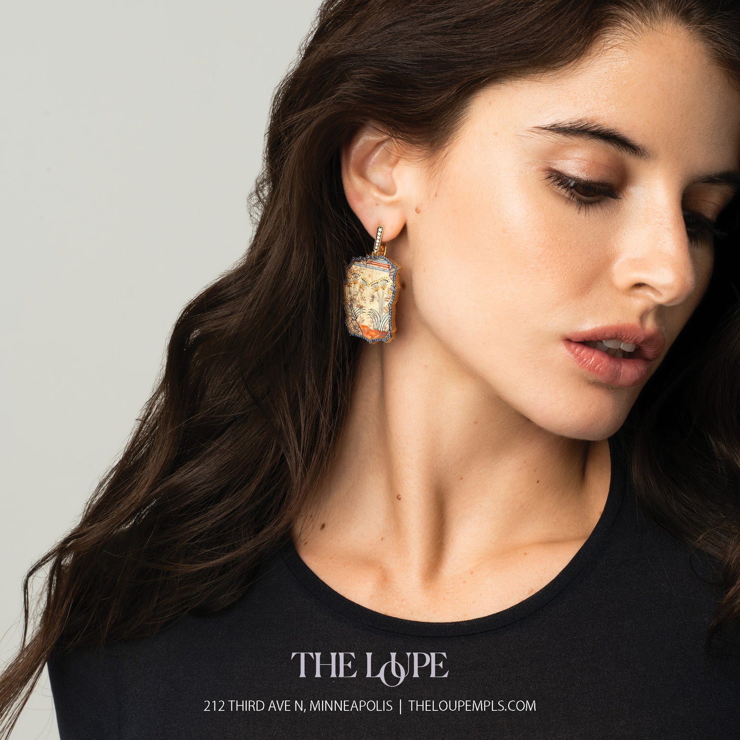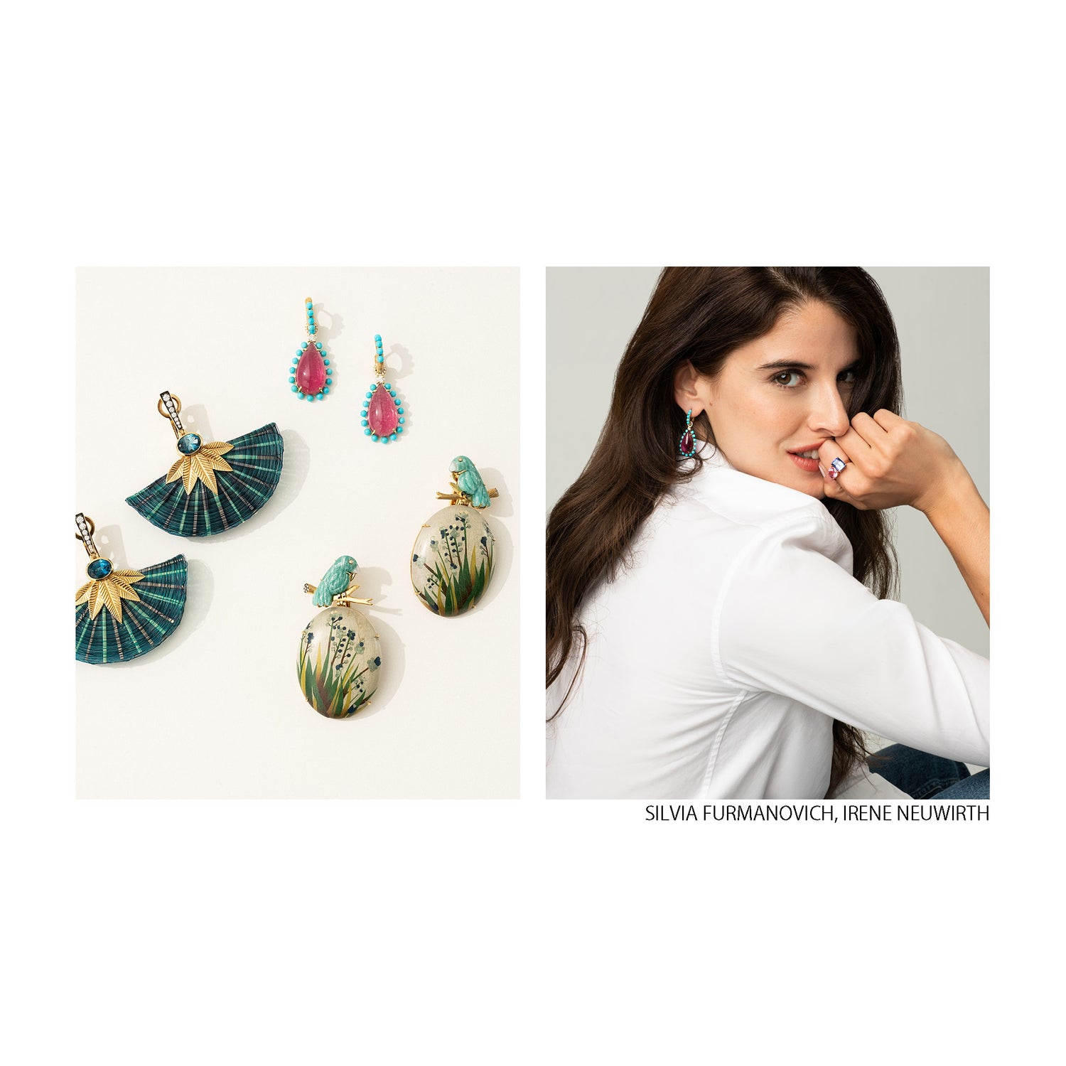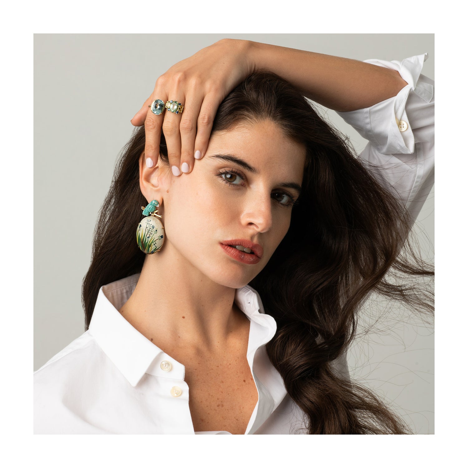 Silvia Furmanovich Silvia Furmanovich Marquetry Floral Bird Earrings with Diamonds and Blue Stone Silvia Furmanovich Half Moon Horse Mane Earrings with Diamond and London Topaz