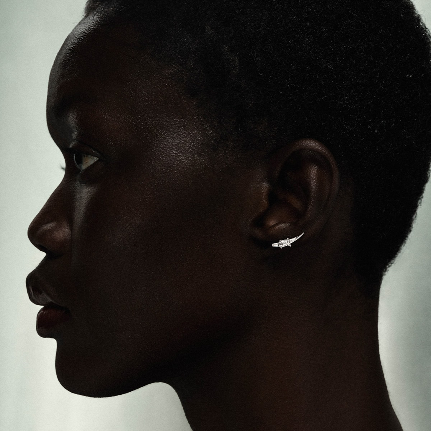 Wrap your ear in the fierce elegance of the Diamond Alligator Ear Climber. Designed in white gold with a dazzling array of baguette-cut diamonds, this piece traces the curve of your ear like the alligator’s fluid, sculptural form. A bold yet refined piece, the ear climber makes an empowering statement while maintaining its versatility. Sold as a Single- Right Ear